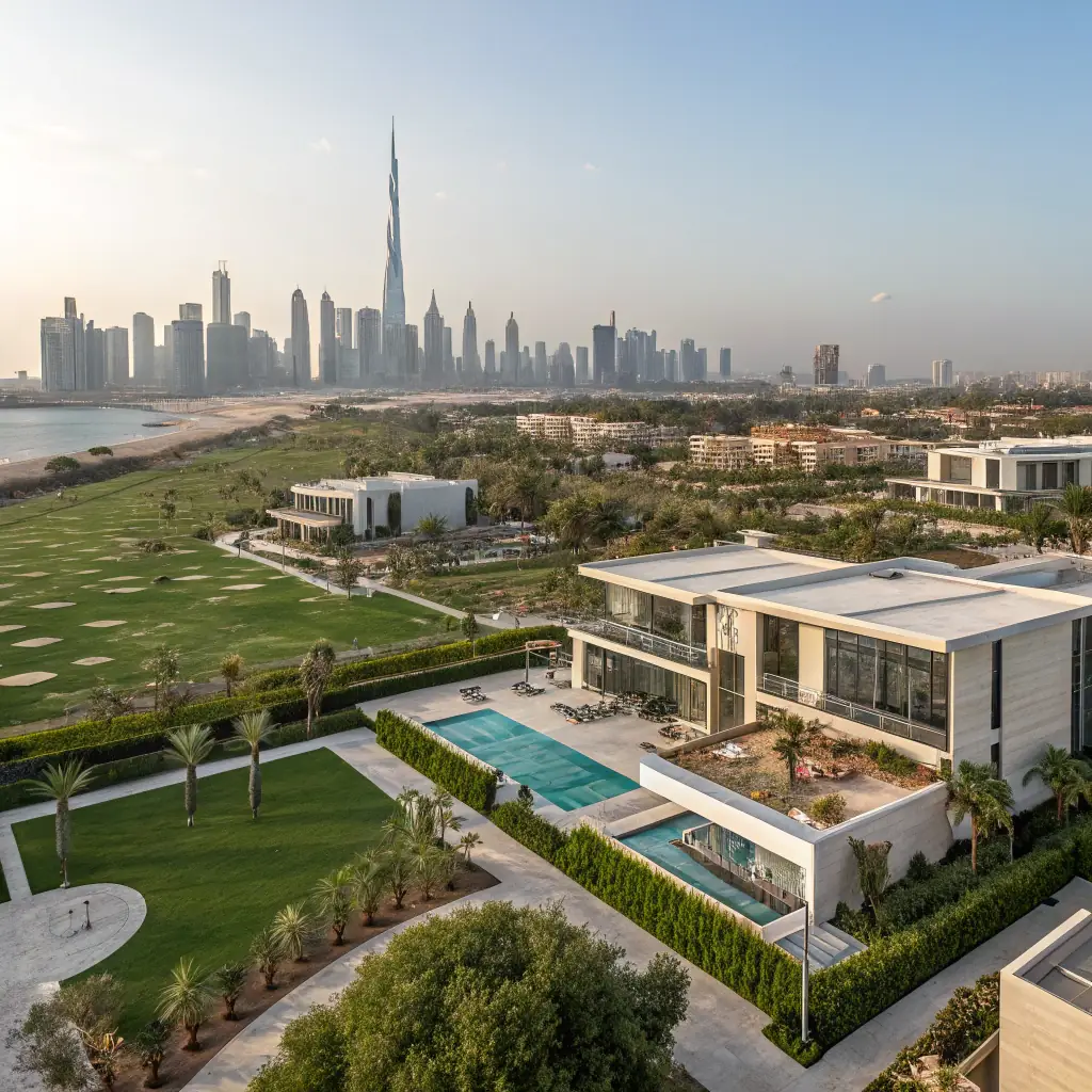 A modern architectural rendering of a luxury apartment complex in Dubai, emphasizing sleek design and high-rise living, set against a backdrop of the Dubai skyline at sunset.
